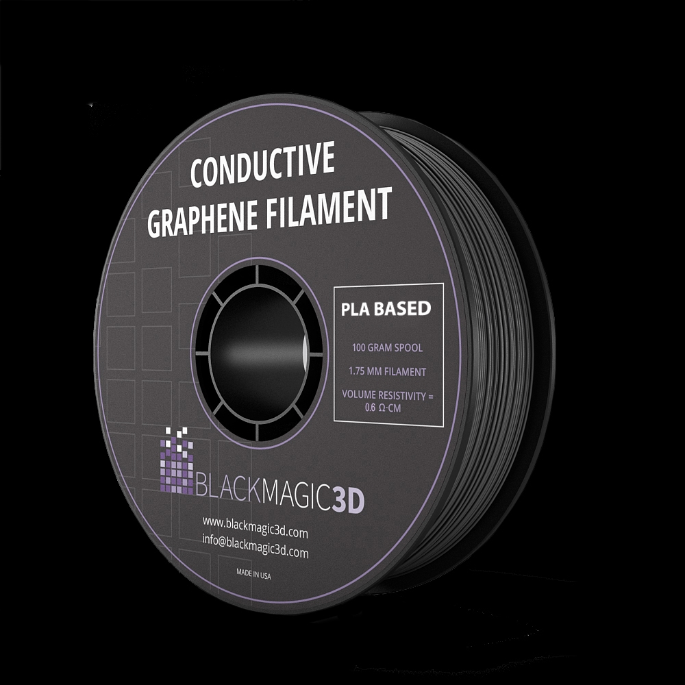 Note: The electrical resistance of a circuit must be considered in order to successfully use Conductive Graphene PLA Filament in electronics applications; specifically, the filament is designed for low-current applications.